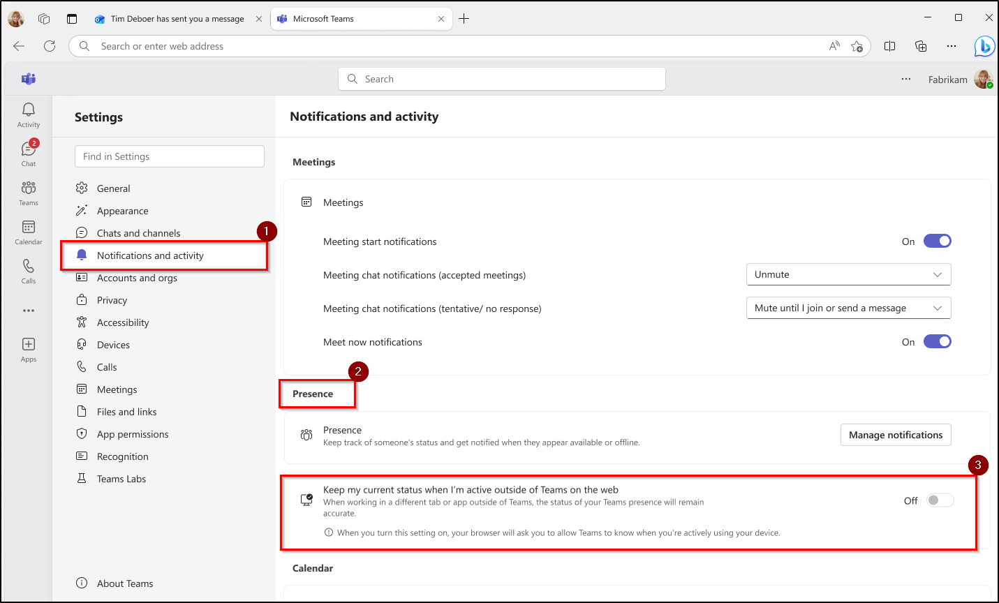 - Under the Presence section, locate and toggle on this option: “Keep my current status when I’m active outside of Teams on the web.”