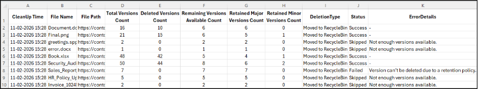 This script automates version history cleanup in SharePoint Online while capturing key attributes such as CleanUp Time, File Name, File Path, Total Versions Count, Deleted Versions Count, Remaining Versions Available Count, Retained Major Versions Count, Retained Minor Versions Count, Deletion Type, Status, and Error Details.