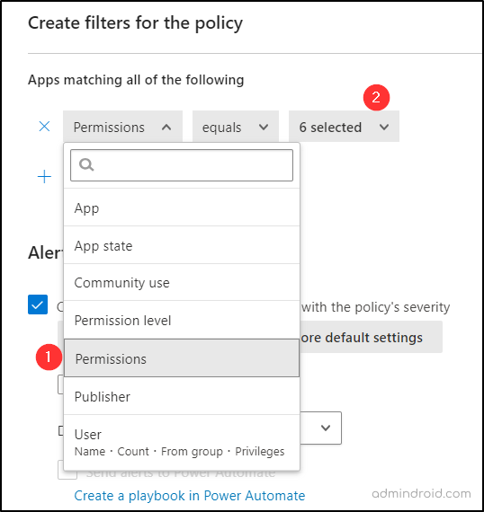 - Since there’s no built-in alert for new app additions, here’s a quick workaround. Head to the “Create filters for the policy” section, choose the ‘Permissions’ filter, and select all the sensitive permissions you want to track. This way, you’ll catch any new apps that ask for high-level permissions.
