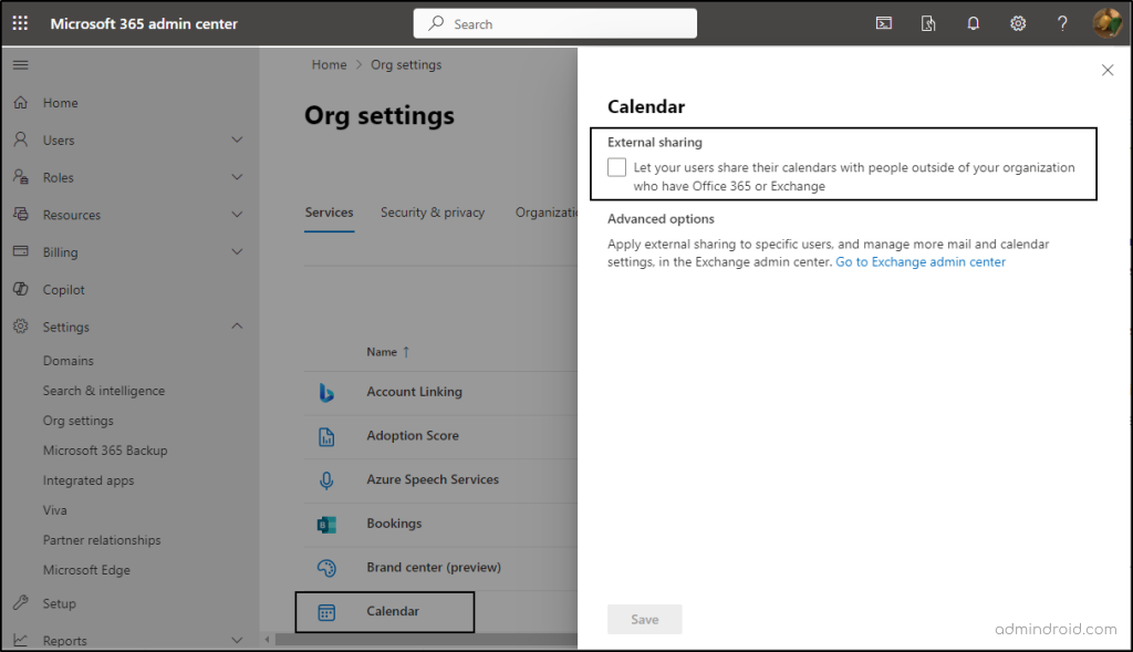Here, uncheck the “Let your users share their calendars with people outside of your organization who have Office 365 or Exchange” option -> Then, save.