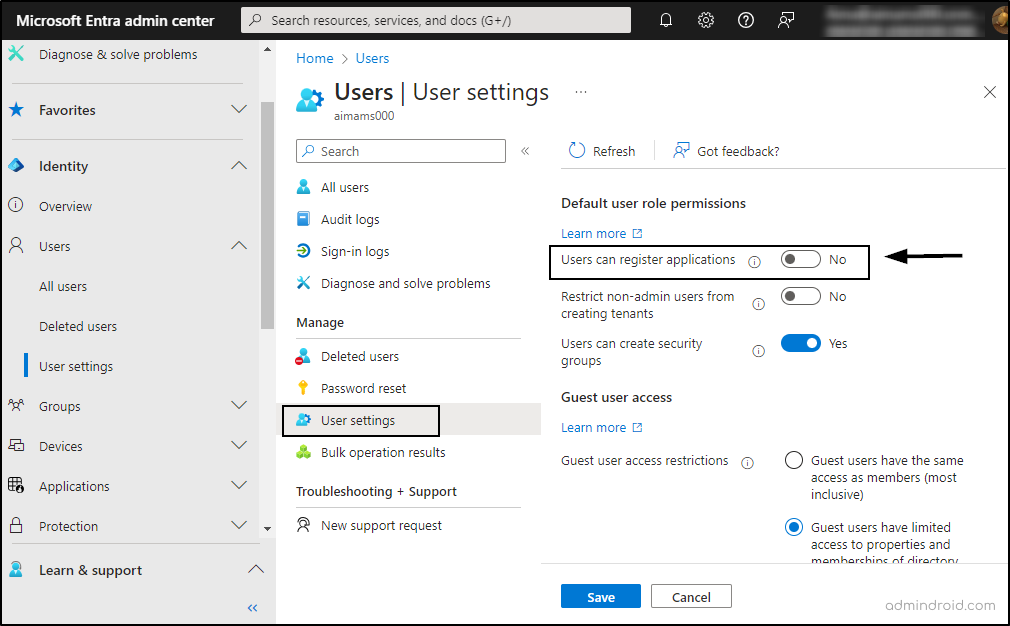 - Locate ‘Users can register applications’ option under ‘Default user role permissions’.