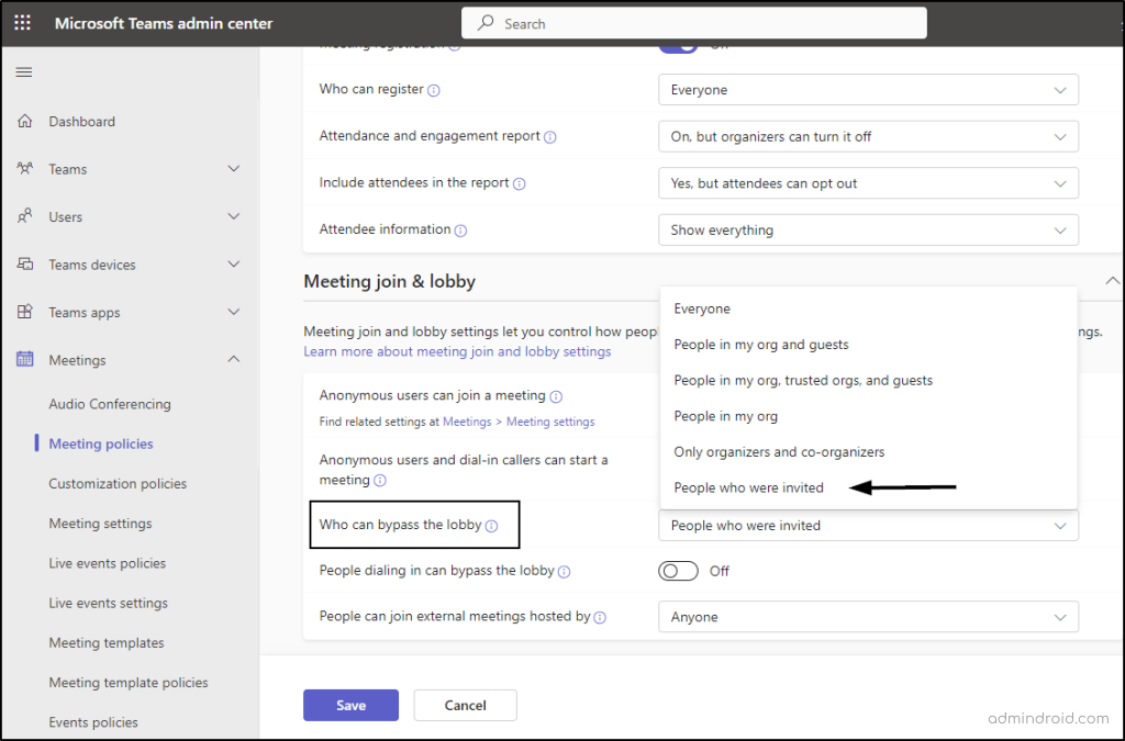 - Under ‘Meeting join & lobby’, toggle ‘Who can bypass the lobby’ to ‘People who were invited’.