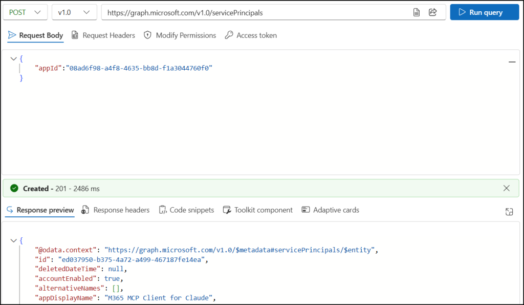 - In the Request Body, enter the following query to create the service principal “M365 MCP Client for Claude”.