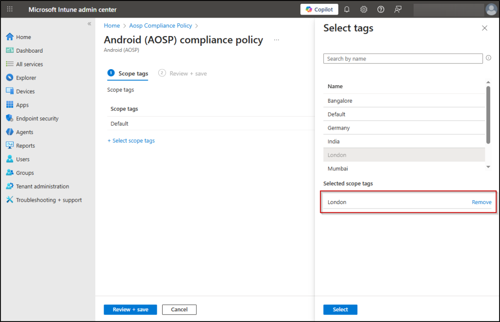 - On the Scope tags page, select the custom tag you created above. (e.g., London). This limits which Intune objects the admins can see in the console. Choose Next.