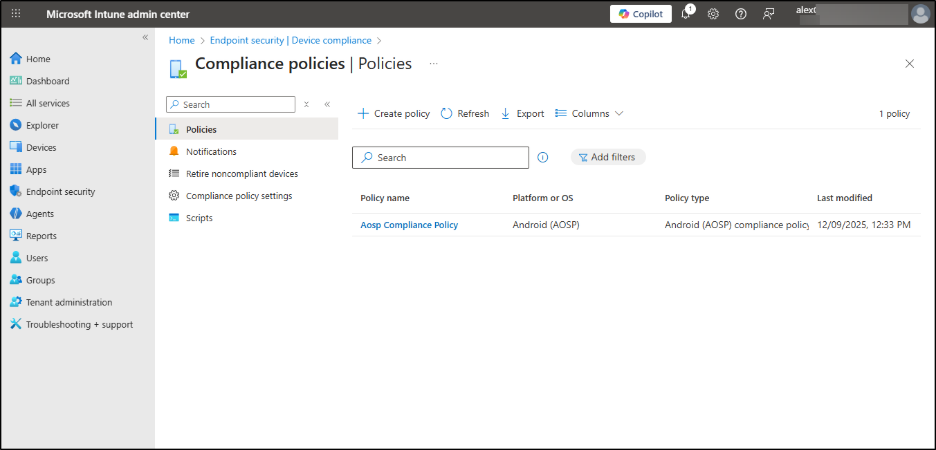 - Open the Intune admin center, navigate to Endpoint security → Device compliance → Policies.