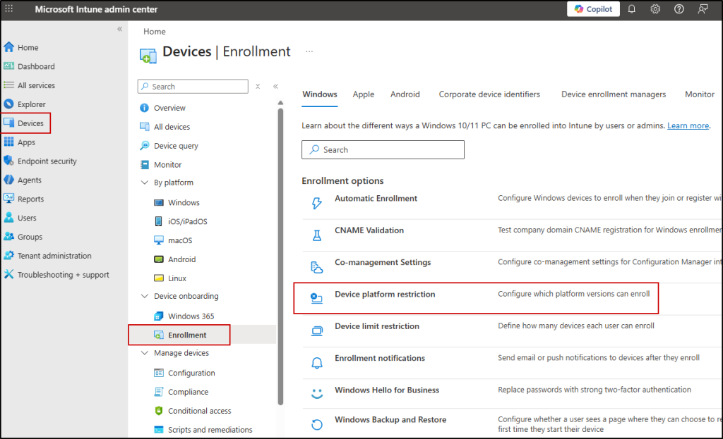 You might wonder — instead of using this new setting, why not simply block personal Windows devices using enrollment restrictions in Microsoft Intune? This setting is available in the Intune admin center under Devices > Device onboarding > Enrollment > Device platform restriction.
