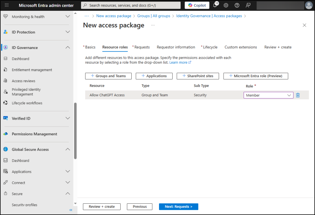 Hint: In this case, I am including an empty security group named “Allow ChatGPT Access”. Make sure the group is empty; otherwise, users may gain ChatGPT access without going through the access package request process.