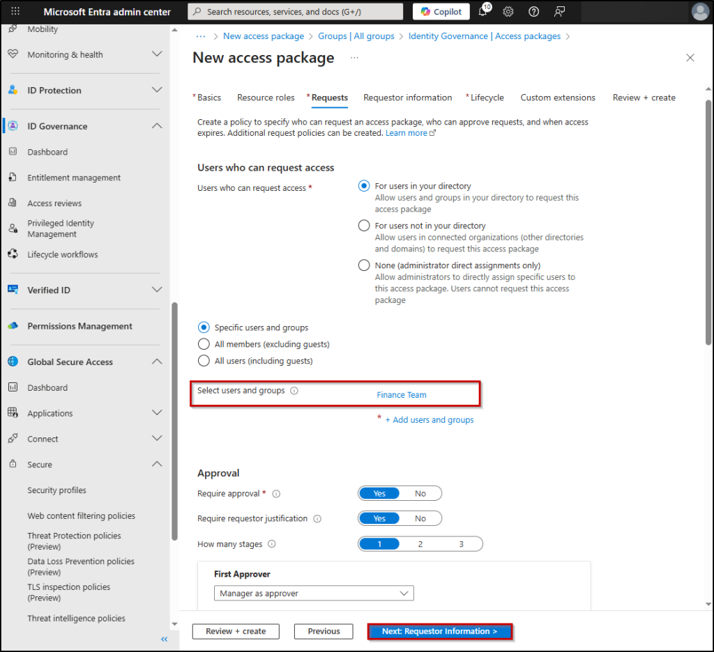 10. Then, you will have the option to select specific users, all users excluding guests, or including guests. I selected Finance Team to allow only its members to request this access package.