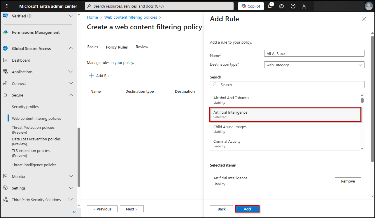 - In the “Destination Type” field, choose webCategory, select Artificial Intelligence, and click Add.