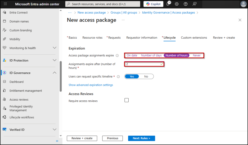 18. In ‘Access package assignments expire’ field, specify a time span to provide Just-in-time access to ChatGPT, I am specifying 2 hours by choosing Number of hours setting.