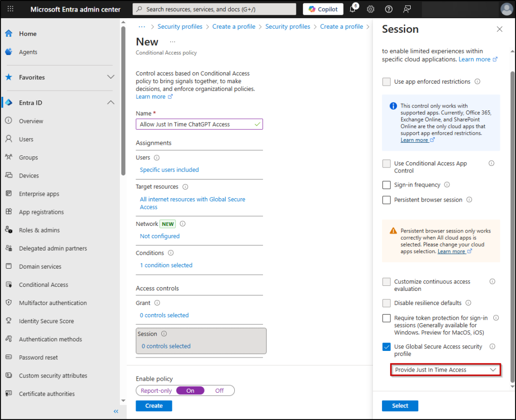- Under ‘Session’, check the Use Global Secure Access security profile option.