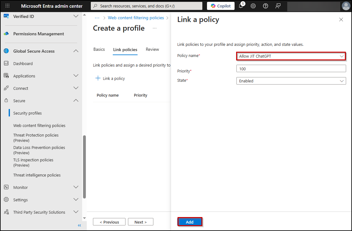 - Navigate to Global Secure Access → Secure → Security profiles and create a new security profile by clicking + Create profile.