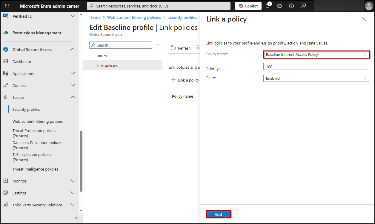 - Navigate to Global Secure Access –> Secure –> Security profiles –> Baseline Profile –> Edit profile.