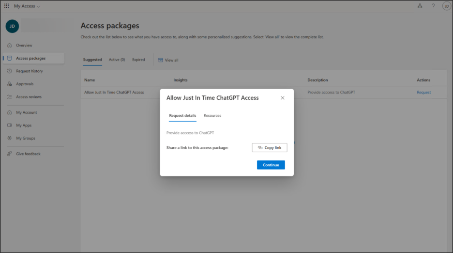- Sarah navigates to the My Access Portal, finds an Access Package named “Just-in-Time ChatGPT Access,” and clicks “Request.”