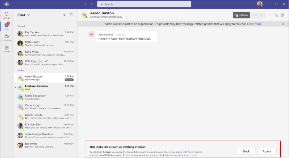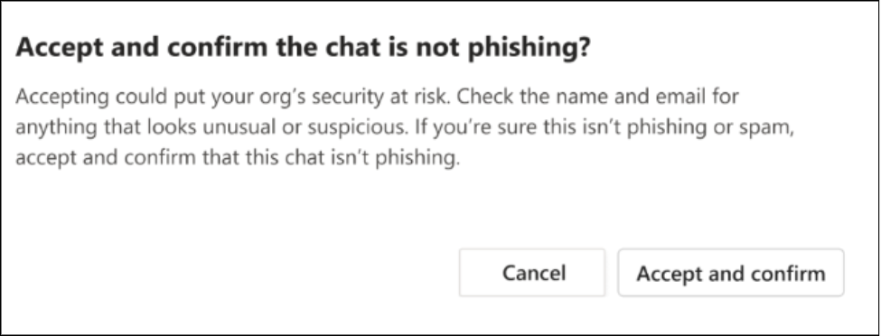 If the user decides to accept the chat despite the warning, Teams doesn’t simply proceed—it adds one final safeguard. Users are prompted again with a confirmation dialog that: