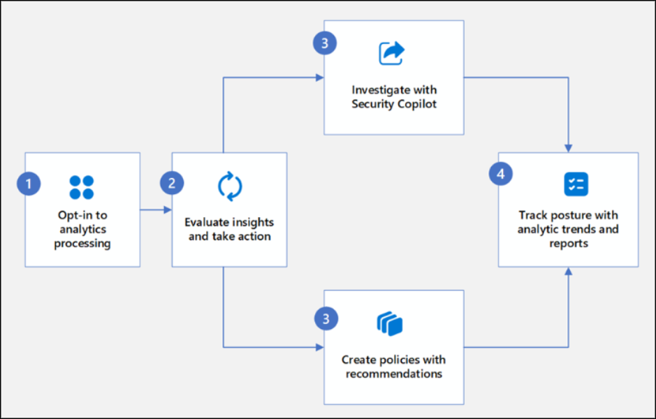 The DSPM workflow involves a four-step process: opting into analytics, evaluating insights, investigating or creating policies, and tracking your data security posture with reports. Let’s look at them one by one.