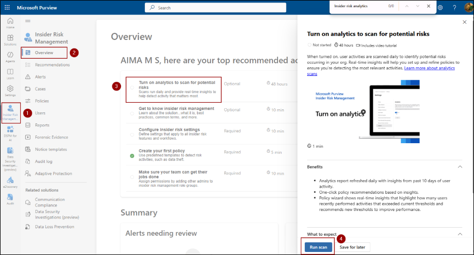 Microsoft Purview portal -> Solutions -> Insider Risk Management -> Overview -> Turn on analytics to scan for potential risks -> Run Scan.