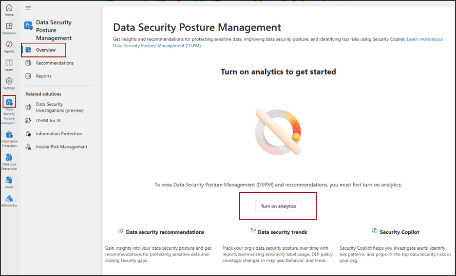 Microsoft Purview portal -> Solutions -> Data Security Posture Management -> Overview -> Turn on analytics