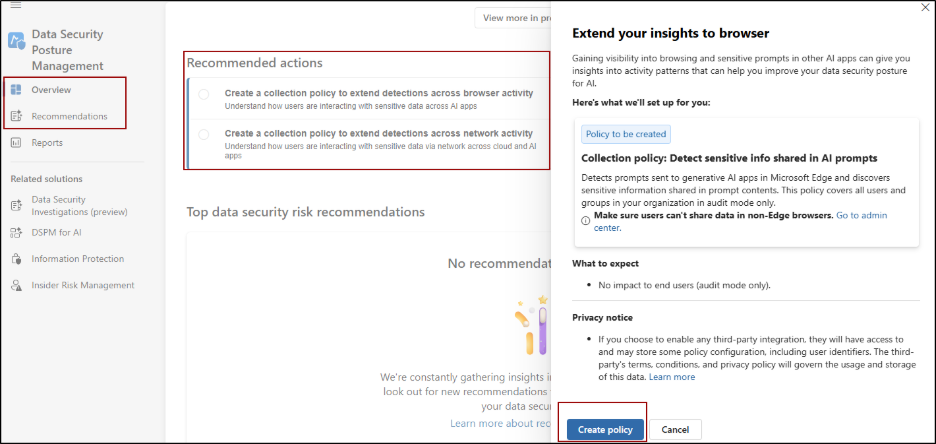 - Instead of always creating new policies, you can also use the insights from recommendations to update or refine existing IRM or DLP policies.