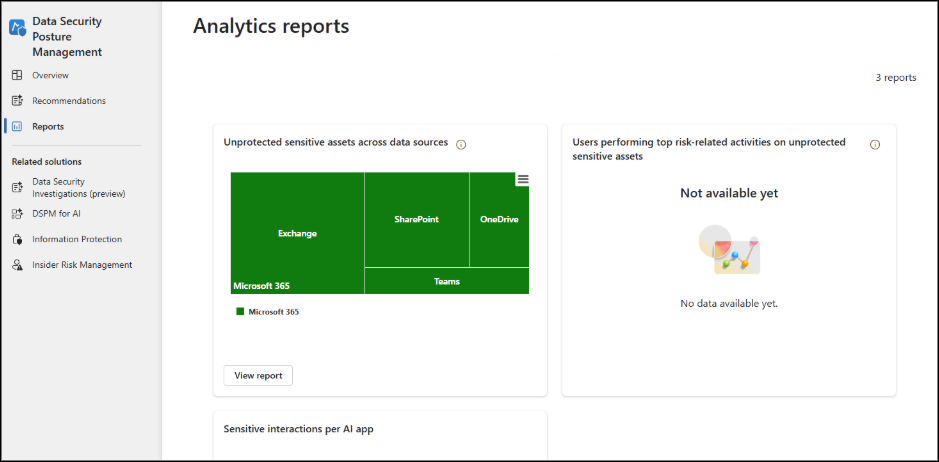 Tip: Use Microsoft Purview reports to get a more detailed view of your organization’s sensitive assets and risky activities. These insights help you maintain compliance with data protection policies and regulatory requirements.