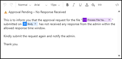 Once a file is submitted, the flow pauses at the approval stage and waits for an admin decision. Based on the outcomes, such as approval, rejection, or timeout, the flow continues accordingly.