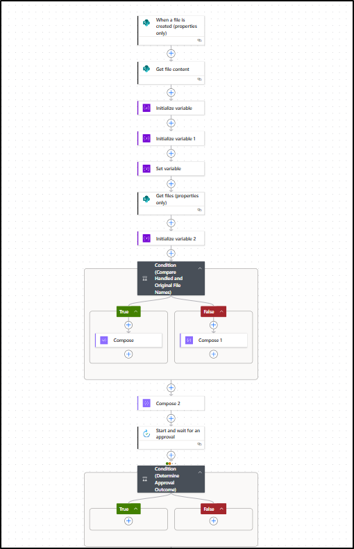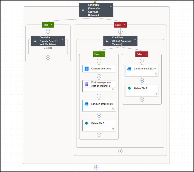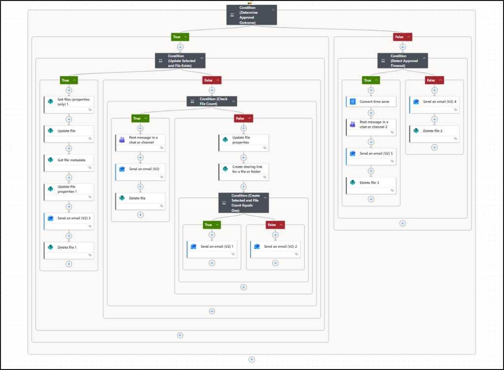 With this, the entire True path of the admin approval under Condition (Determine Approval Outcome) is complete and should appear as shown below.