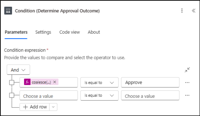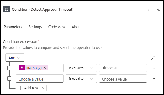 | coalesce(outputs(‘Start_and_wait_for_an_approval’)?[‘body/outcome’], ‘TimedOut’) | is equal to | TimedOut |