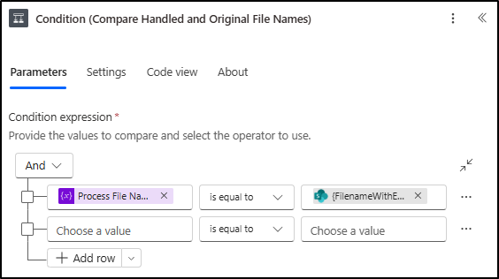 - Now, add a Condition (Name as: Compare Handled and Original File Names), set the values from the table below to compare the processed file name with the original file name.