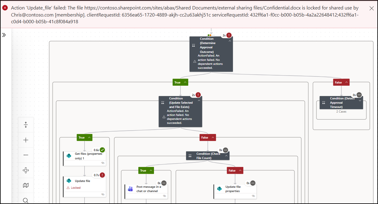 2. Action Update failed: The file <FileLink > is locked shared use by chris@contoso.com.