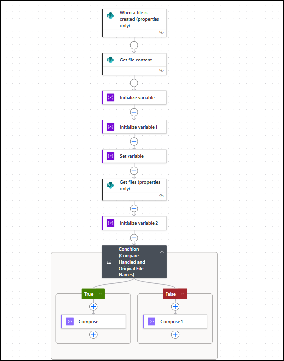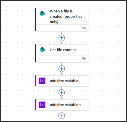 The flow begins when a file is uploaded to a specific folder in SharePoint.