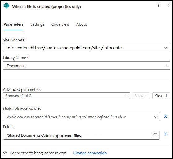 - Select the restricted SharePoint site address & document library from the dropdown and add the appropriate folder name under the ‘Advanced parameters’.
