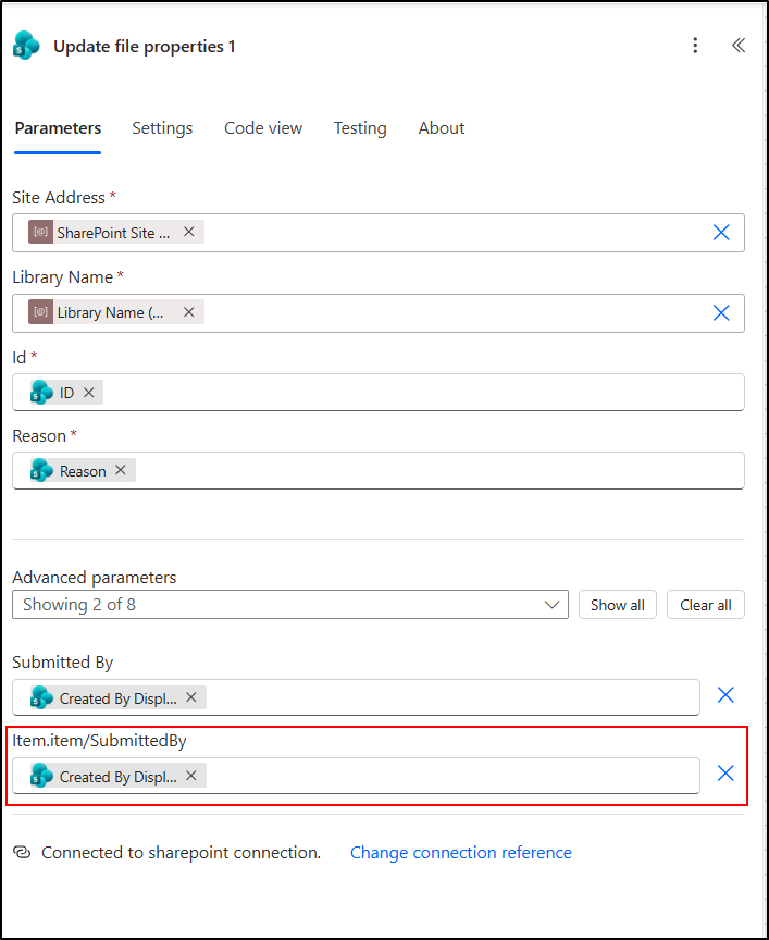 Next, open the Update file properties action in the flow, remove the parameter Item.item/SubmittedBy, and then save the flow again.