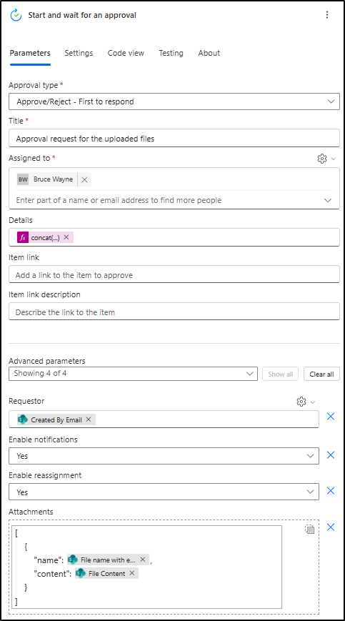 After completing this step, the flow will be extended to handle cases separately. There are three possible outcomes: the admin approves the file, the admin rejects it, or the approval action times out. Let’s proceed to the next step, where the admin approves the attachments.