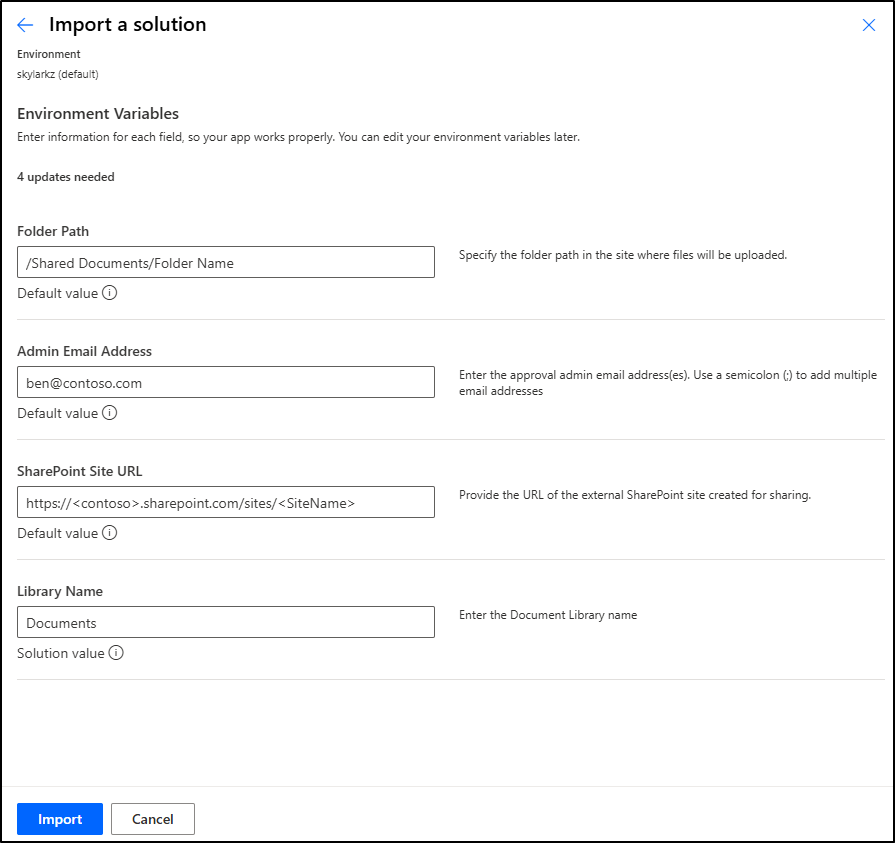 - Once you have replaced the default values, click Import to start importing the flow in solutions.