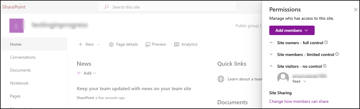 Anyone in the channel can approve or reject the request directly from Teams adaptive card. Once approved, the guest user is automatically added to the correct SharePoint group, receives a confirmation email, and the SharePoint list request status gets updated as ‘Approved’. You can verify this by navigating to your SharePoint site -> Settings -> Site Permissions and checking under the respective default group (Owners, Members, or Visitors).