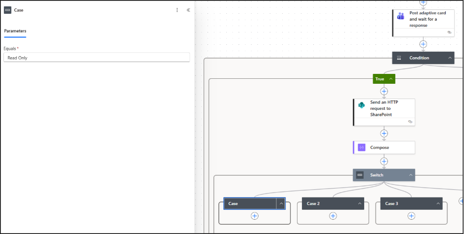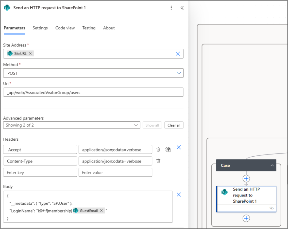For each case created under the Switch action, click ‘+’ ->Add an action and choose Send an HTTP request to SharePoint. Now, to let the flow add the guest into the respective SharePoint group defined by the manager, use the following configuration for each access level.