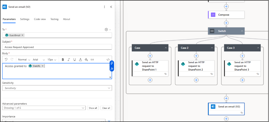 After assigning the guest user to the appropriate SharePoint group, add a Send an email (V2) action to notify the guest about their approved access.