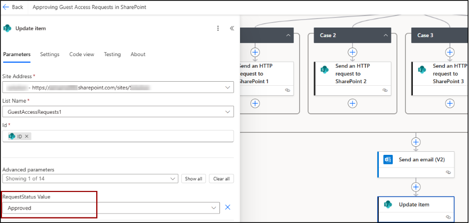 Finally, add the ‘Update item action under the SharePoint section to mark the request as Approved in the SharePoint list.