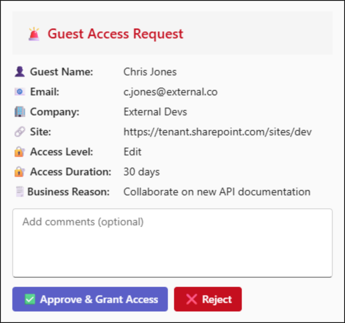 The modern M365 environment runs on approvals, yet the manual process for granting SharePoint guest access remains a huge administrative headache. Verifying if a guest user exists, confirming the access level, and ensuring the request is logged and actioned correctly requires constant, manual follow-up. What should be a quick delegation task turns into a constant source of frustration and potential security risk.