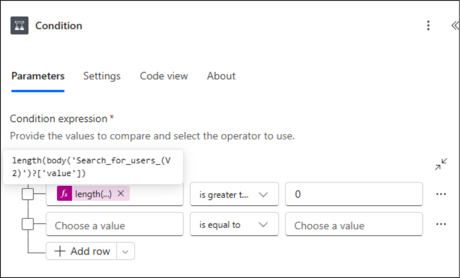 1. Insert a Condition action below the “Search for users (V2)” step and configure it as follows: