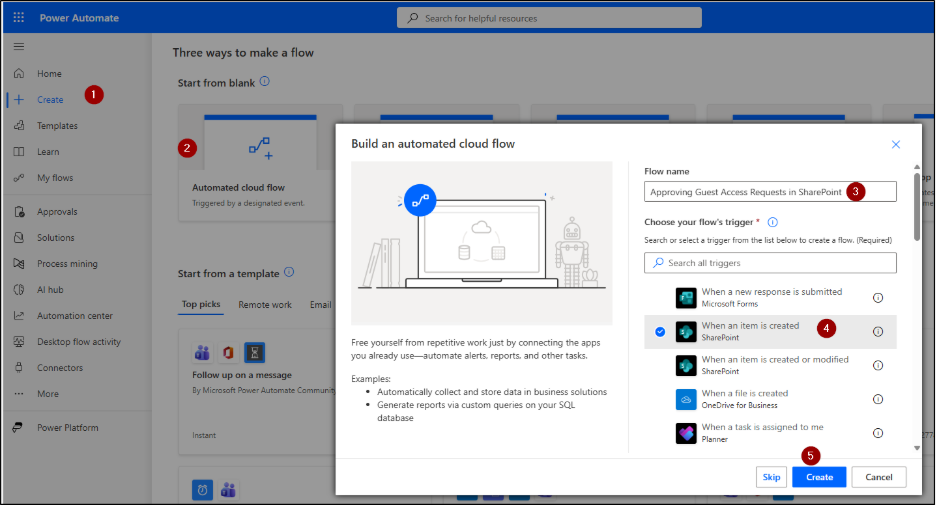3. Name your flow, then select the trigger When an item is created (SharePoint) -> Create.