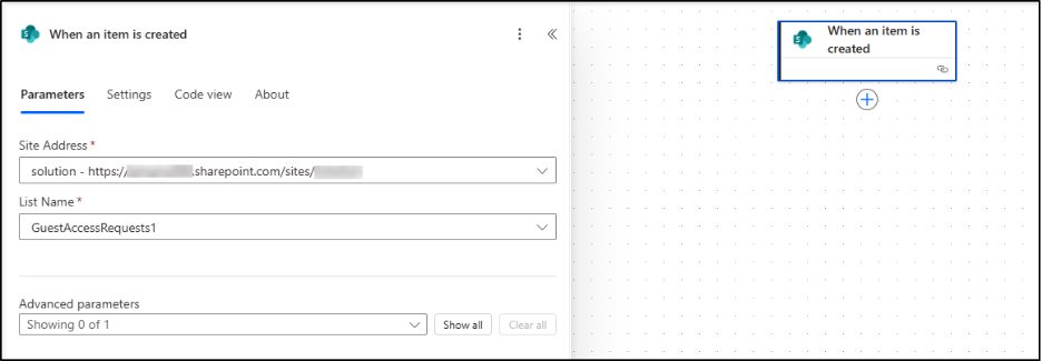 • Site Address: Select Enter custom value, then click the Dynamic content icon and choose SiteURL from the trigger action (If the list isn’t created with headers first, its properties won’t appear in dynamic content).