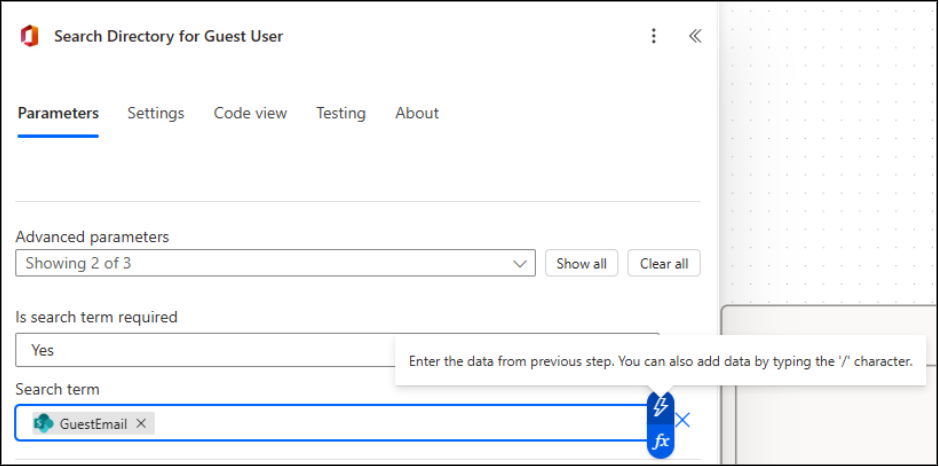 3. In the Search term field, add the dynamic content for the guest’s email address from the SharePoint trigger.