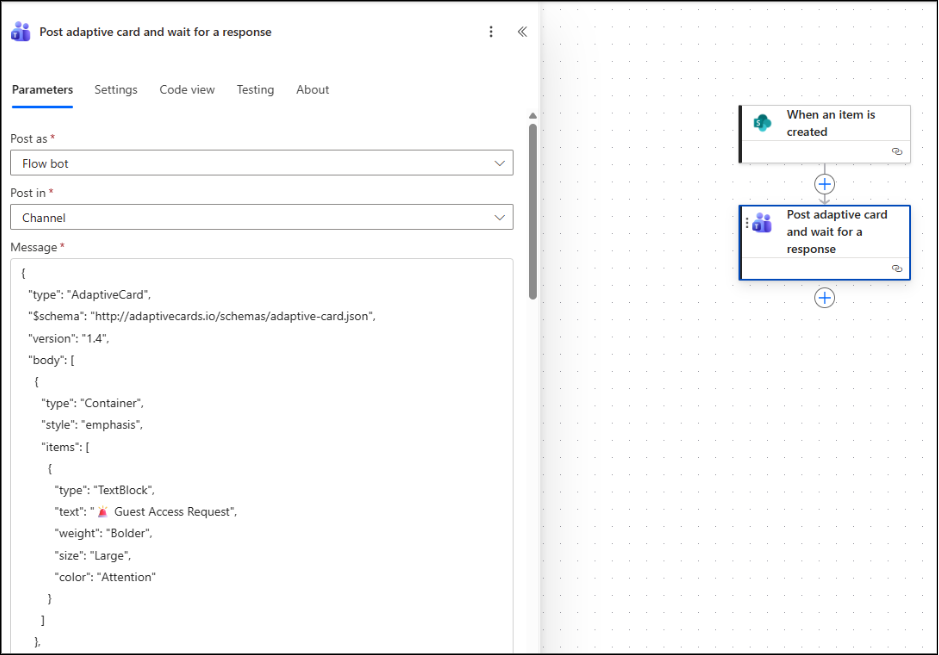 To make this process smoother, we’ll create a Power Automate flow using Adaptive Cards in Teams to handle these guest access approvals.