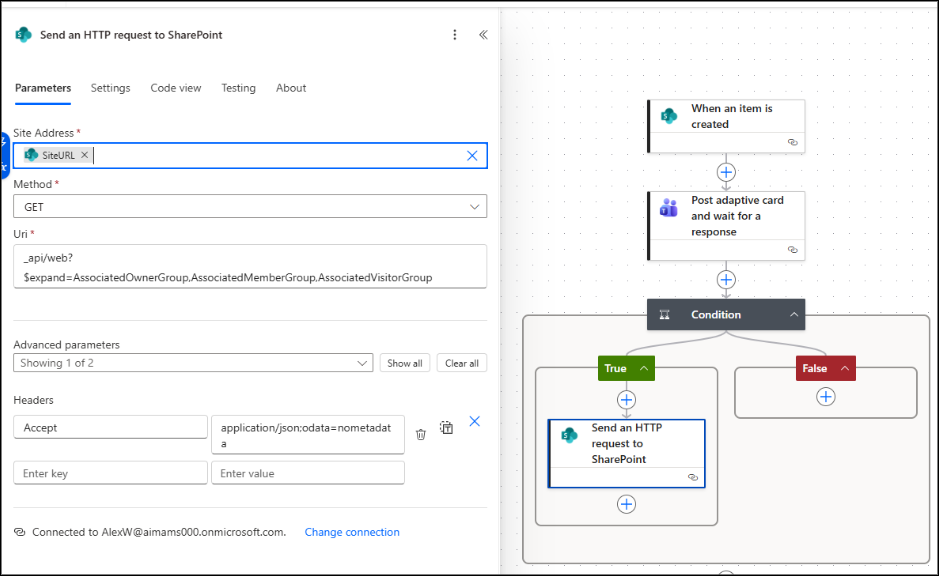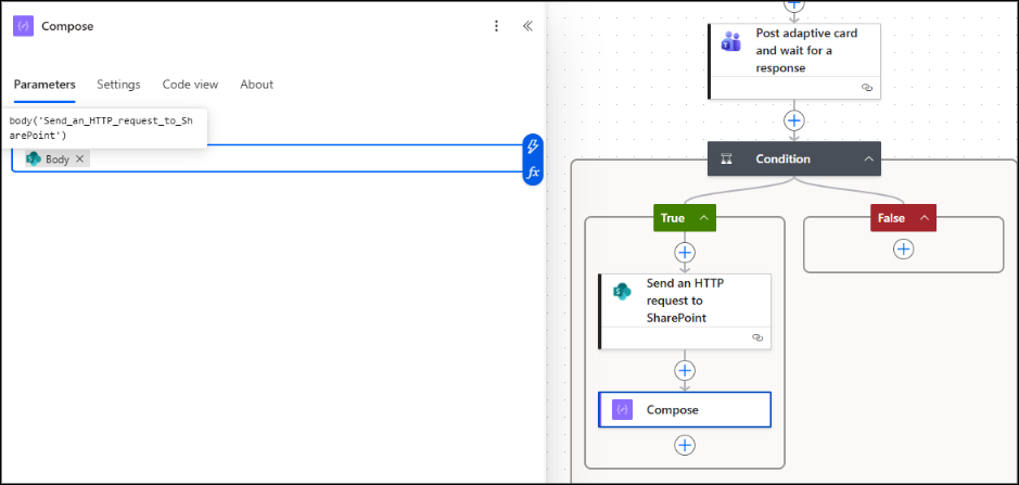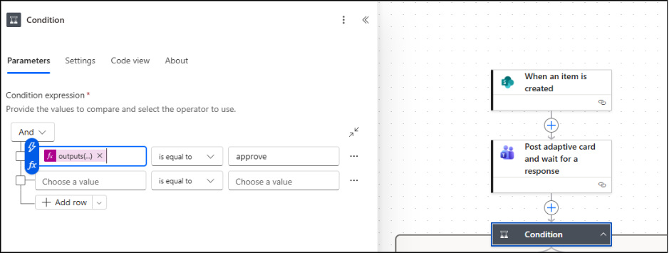 This condition checks whether the admin selected Approve in the Adaptive Card and directs the flow accordingly.