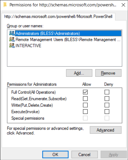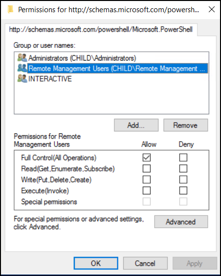- This opens a permissions window showing all users and groups allowed to connect through PowerShell Remoting.