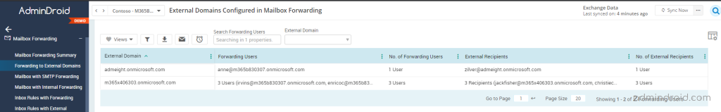 This report shows a list of external domains that are configured to receive the forwarded message. It includes configuration set by both admin and user. The report gives detail about Office 365 mailboxes with external forwarding, External domain, and external recipient. This report will help you to detect and prevent external forwarding.