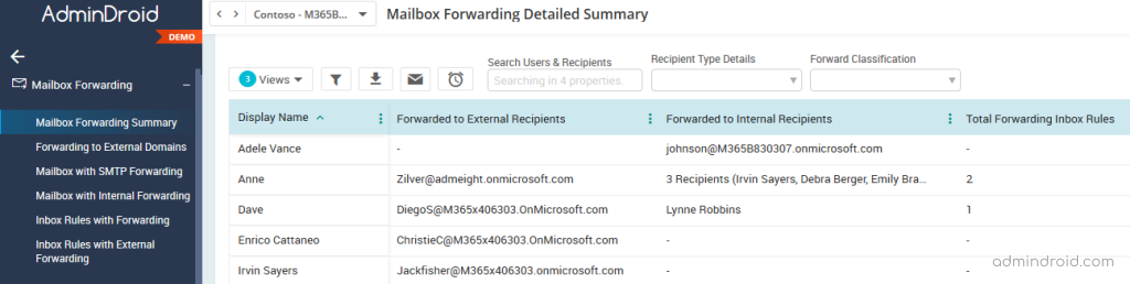 AdminDroid has 6 dedicated Office 365 email forwarding reports to show the detailed email forwarding configurations.