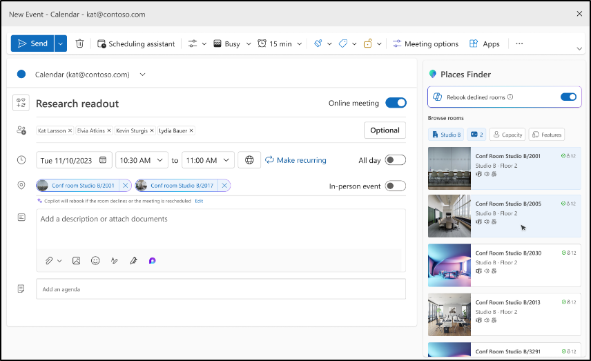 - Places Finder: Go beyond simple room booking with enriched contexts like floor plans, space images, and available technology. This enables organizations to upgrade from the basic “Room Finder” to a full, directory-driven search experience.