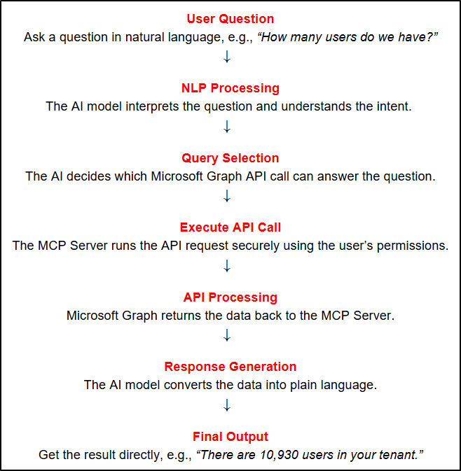 Here is a simplified breakdown when someone asks a question like “How many users do we have in our tenant?” to the MCP server.
